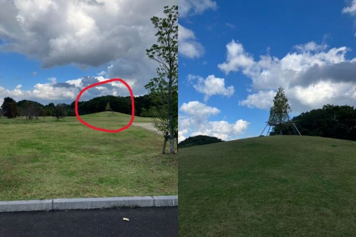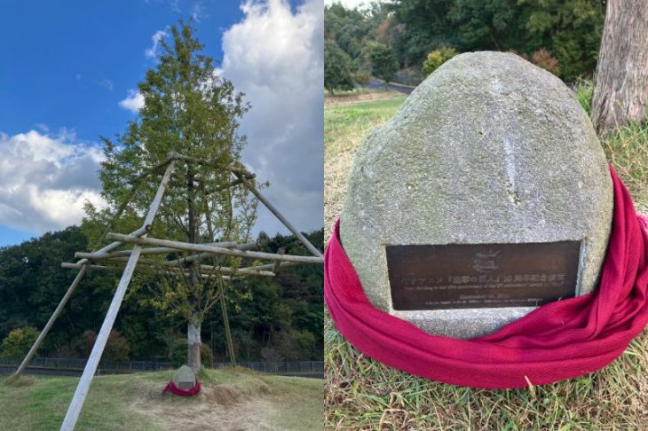 あとこっちはクラウドファンディングとは別なのですが、このダムを建設する際にでた土砂を利用して作られた田来原美しい森づくり公園が付近にありまして(といっても車で10分ですが)、ここにはあの丘の木というスポットがあります。諌山先生と進撃の巨人主人公エレンの声優を担当した梶裕貴氏が土盛り・除幕式をされたそうです。