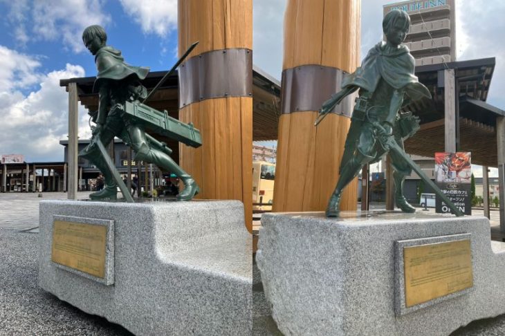 日田駅前には「進撃の巨人」のリヴァイ兵長の銅像がありました。