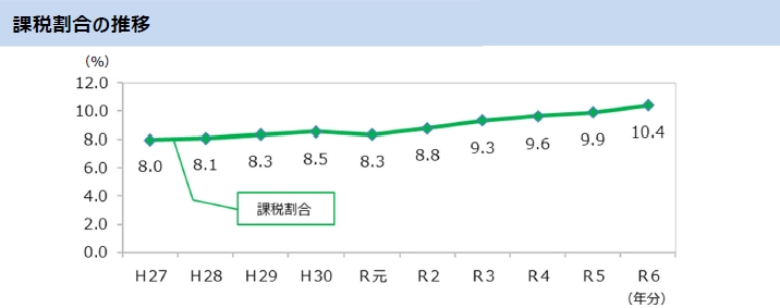 特に注目すべきは課税割合(10.4%)です 。前年の9.9%から0.5ポイント上昇し、ついに10%の大台に乗りました 。